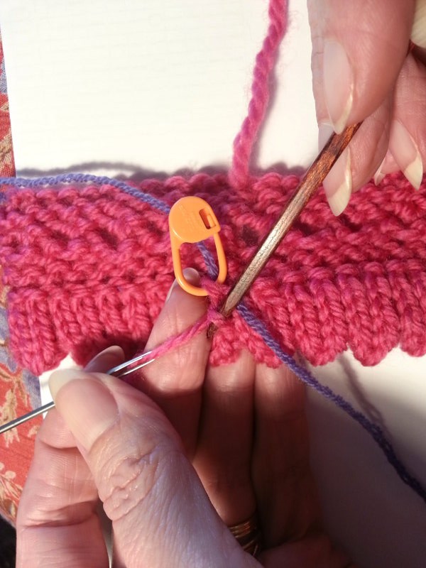 Immediately after working the round marked with a ◄ put in a safety line. Put it in the back (the inside of the muffatee) picking up every bump that is a “down bump” between the sts on the needle. These are the running threads between each st.
